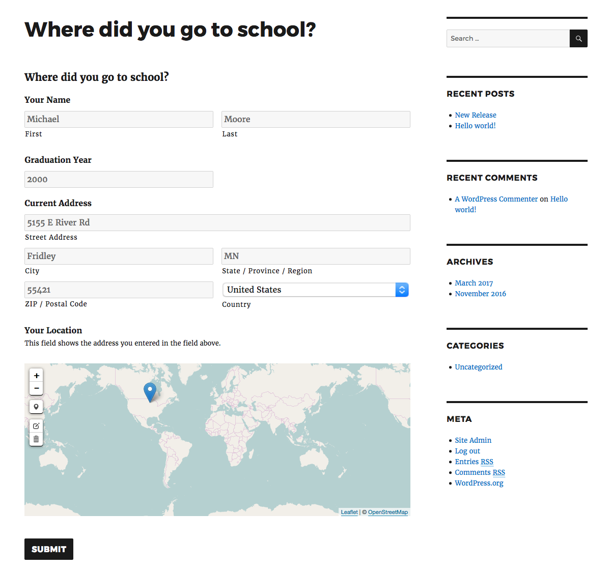 Geocoder field, that value will be stored as spatial metadata.Brilliant Geocoder for Gravity Forms uses WP-GeoMeta internally. For sample