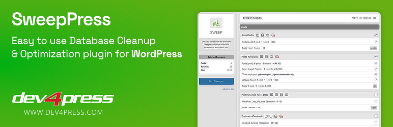 SweepPress is an easy-to-use WordPress plugin built around 52 different Sweepers for database cleanup (the Pro version has 57), support for WP-CLI, and WP REST API to perform the cleanup operations. The plugin also features a powerful WordPress Options database table management panel.