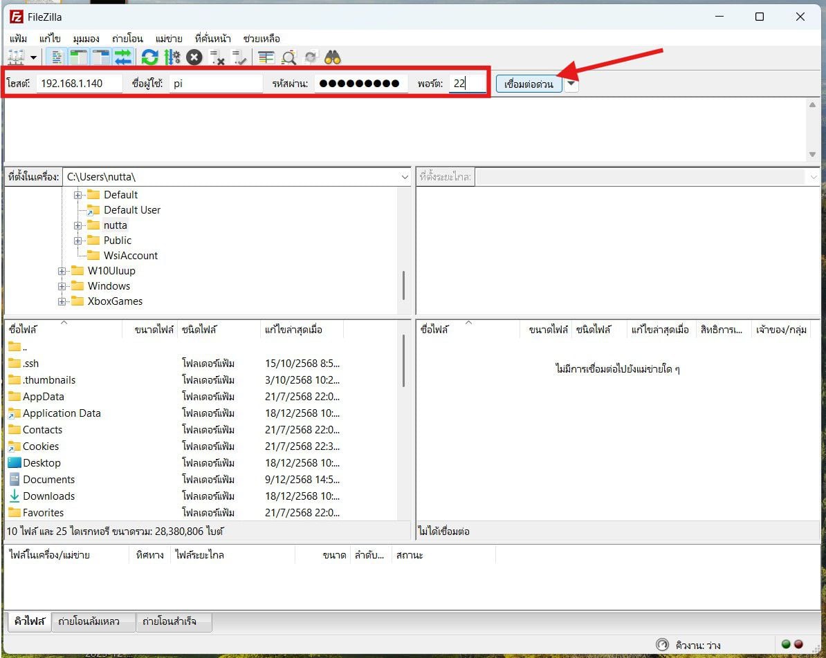 หมายเหตุ: ถ้า SSH ไม่เปิด FileZilla จะเชื่อมต่อไม่ได้