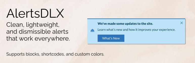 AlertsDLX offers beautifully styled alerts, callouts, and notification boxes for Gutenberg (the Block Editor), Full-Site Editing (FSE), the Classic Editor, or anywhere blocks and shortcodes are supported, including most page builders.