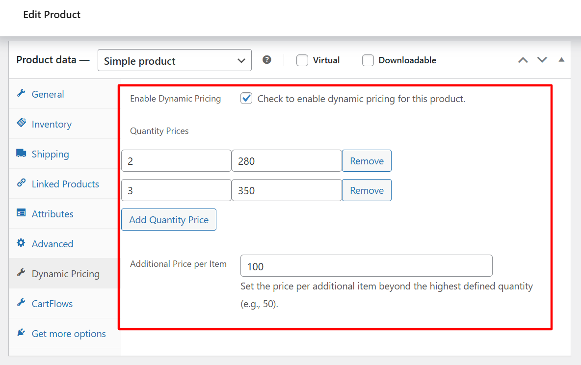 Dynamic Pricing Tab in Product Editor: Easily enable dynamic pricing and set quantity-price pairs for your WooCommerce product.