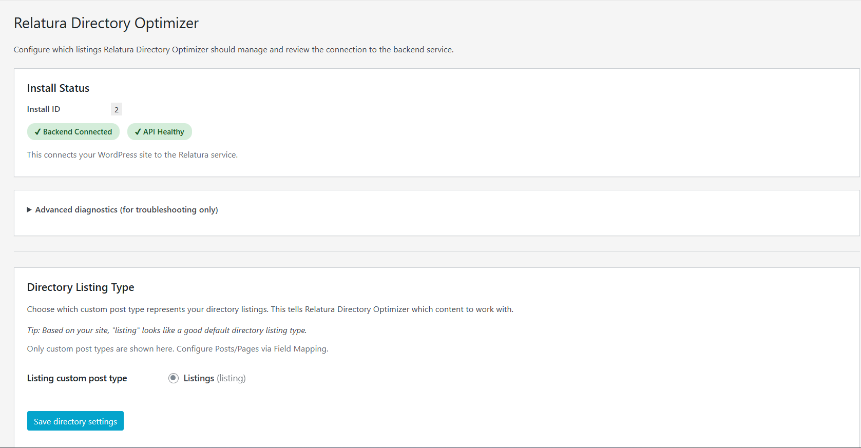 • Field Mapping interface mapping WordPress directory fields to Relatura’s normalized schema.