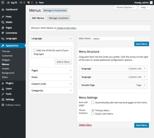 - open the “language” tab on the left, check the checkbox and click “Add to Menu”. Repeat it once for every language.