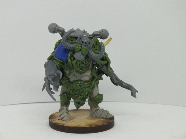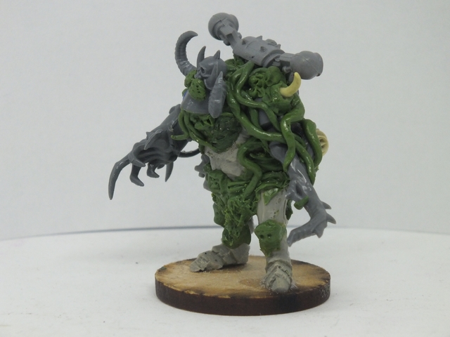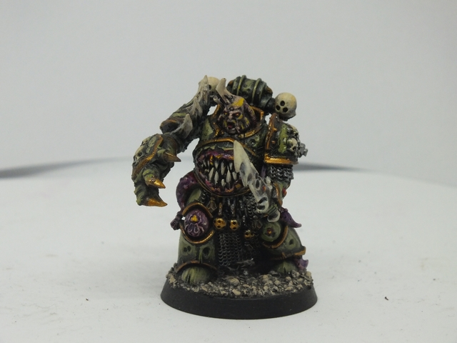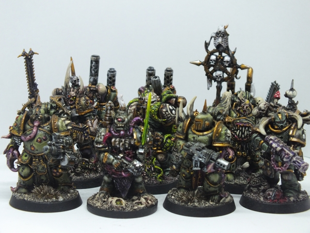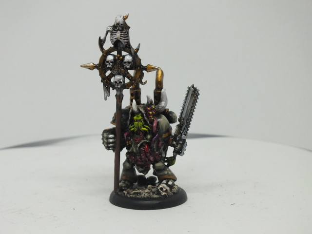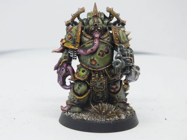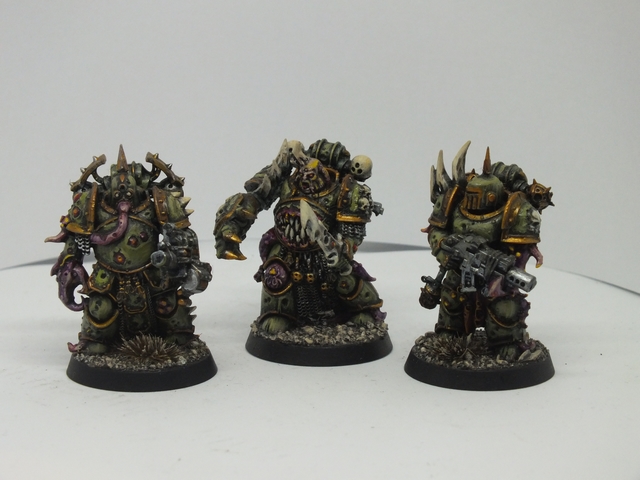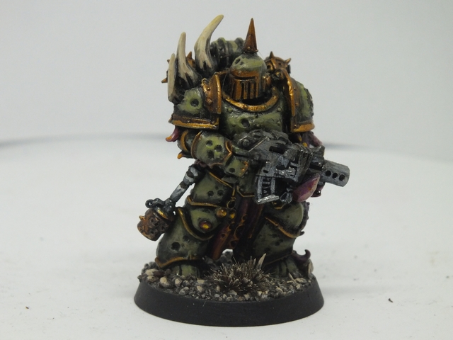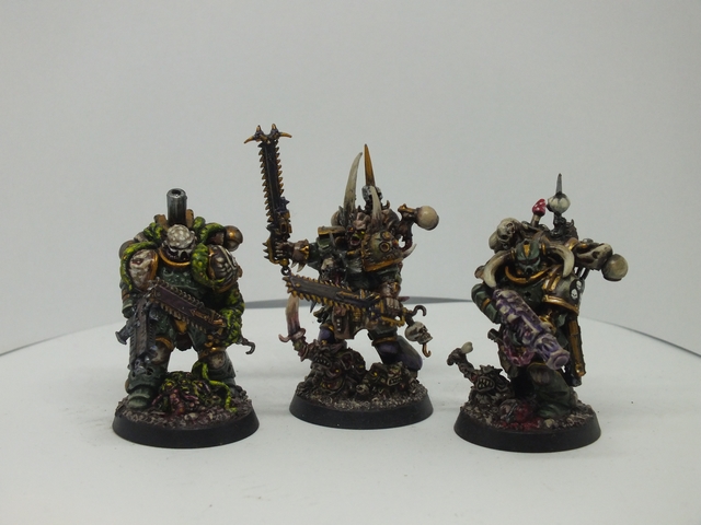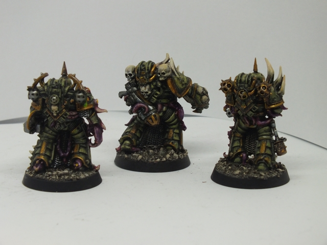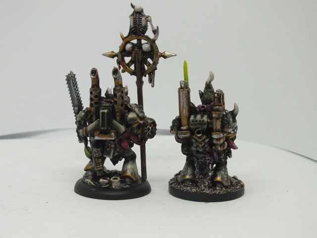 These three consist of the first being again like the previous, a mix of said bits from all sorts of bits, while the standard bearer and the end one were from resin figures I got from Curtis at Ramshackle Games. These were miscasts and broken, so I got to work repairing and adding to them to fit the army. the banner was made from Milliput and then painted up with a suitable Death Guard cult pattern that will be present in any additional cult iconography and vehicles (and trust me, I plan on making a proxy Rhino or vehicle dedicated and crewed by cult members with that colour scheme)