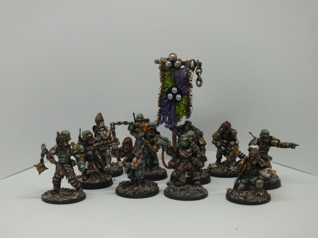 These first lot are the combination of the now out of production sci-fi germans plastic kit (sorry, can’t remember the company who made them) and some Gripping Beast Saracen warriors for the bodies. I only had the heads, arms and backpacks to work with from the German troopers, but wanted the look of greatcoats, so combining the two, I think worked well, and fitted with what troops I already had. I do wish I had more, but since they are cultists, I don’t mind too much since they are supposed to be corrupted planetary defense troop types, that had turned to chaos.