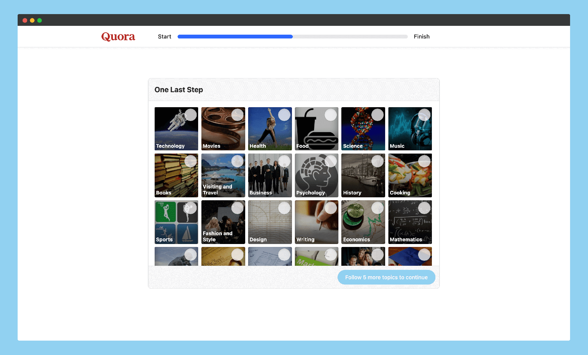 Once your account is created, you will be asked to select the topics you’re interested in. Depending on your preferences, you can choose as many topics as you want.