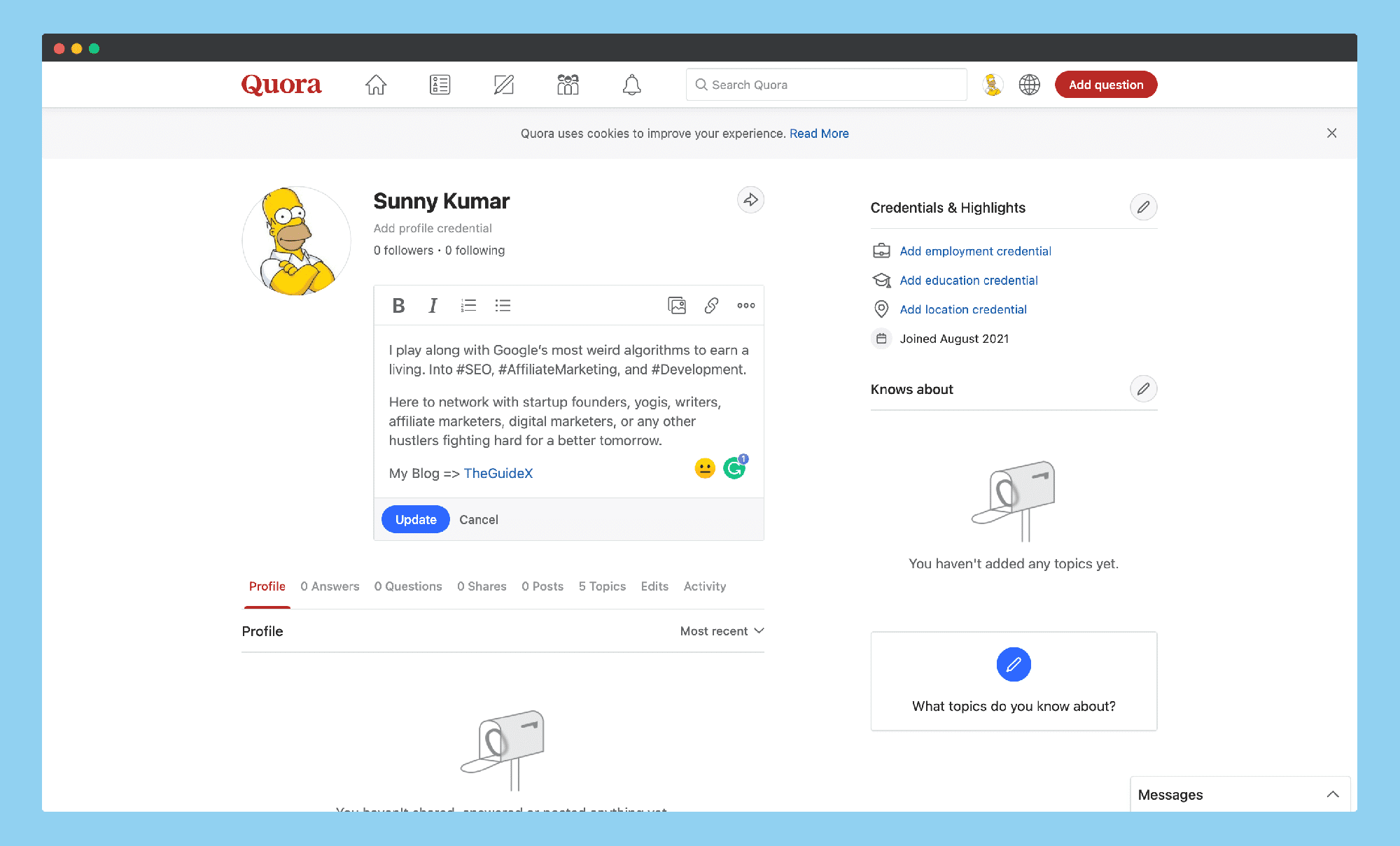So first things first, I head over to Quora and create an account using my real name and professional email. Quora is a bit different from other profile sites because it’s primarily a question-and-answer platform, but the profile creation process is equally important.