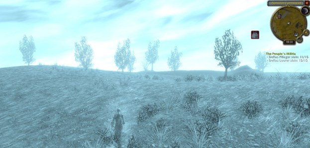 I took the ship from Menthil Harbor to Theramore Isle. I then wended my way along the road you see part of leading out of Theramore. Everything in Dustwallow Marsh is way over my head, but I just kept running. I never died, but lost my Voidwalker several times to spiders and crocs. Most annoyingly, the map above never filled in at all, even as I made my way into the Barrens themselves where everything was right at level.