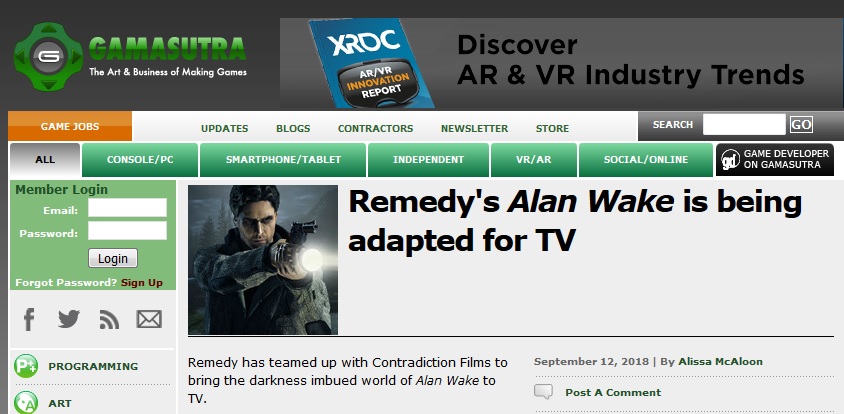 From Gamasutra, Alan Wake, that game which has proven to scary for me to play, is being developed for television! How great is that. I can just put a blanket up over my eyes when it gets too intense! Ideal.