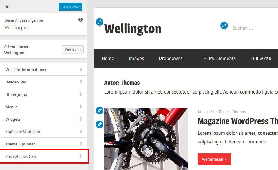 Mit eigenem CSS Code kannst du die CSS Angaben des Themes überschreiben und das Styling der Website anpassen.