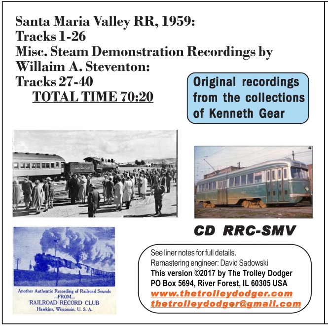 The Santa Maria Valley Railroad, that is, in vintage 1959 recordings prepared for the Railroad Record Club of Hawkins, Wisconsin, but previously unissued, now digitally remastered for your enjoyment on compact disc: