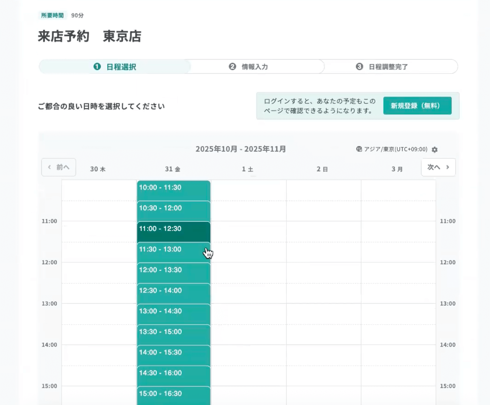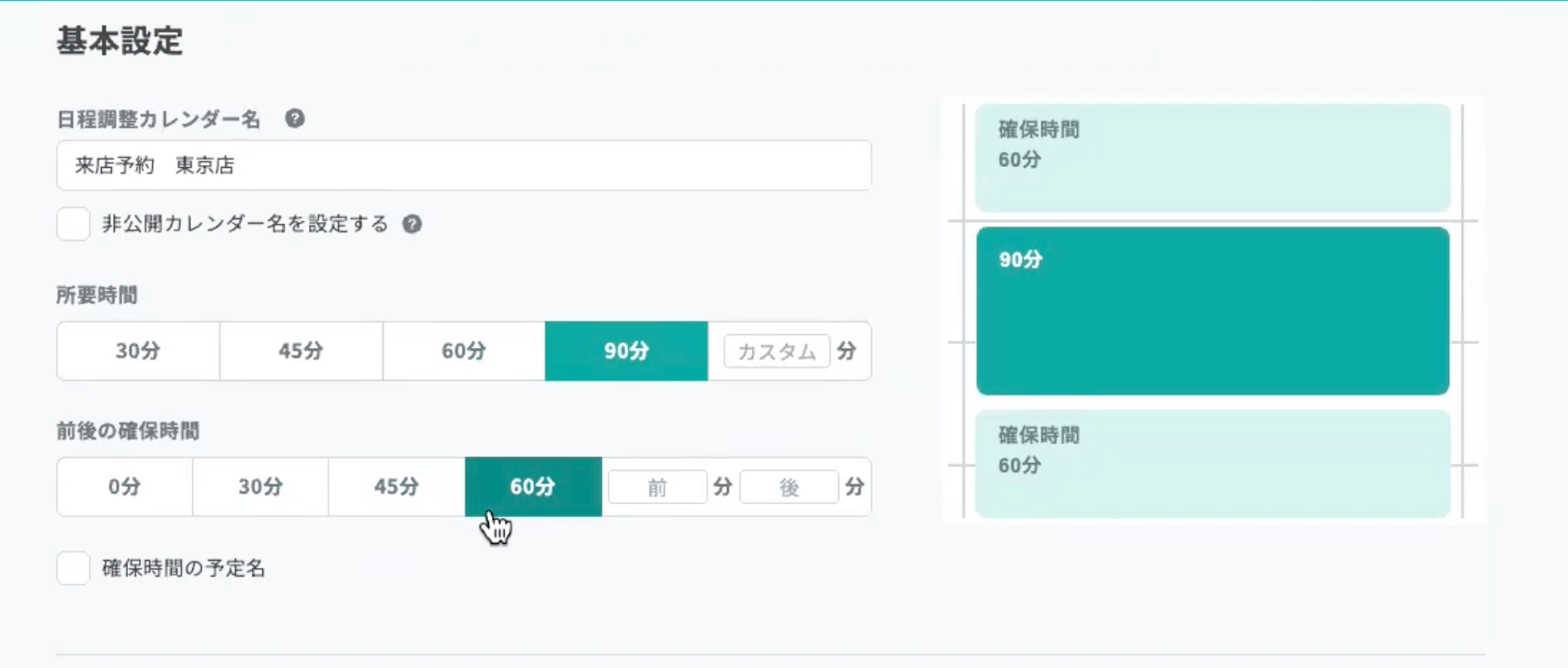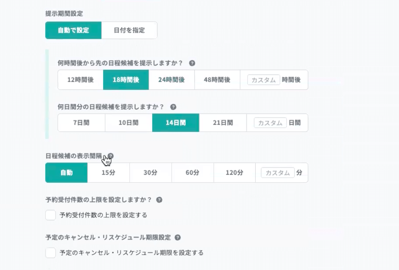 ― その場合は「日程候補の表示間隔」の設定を変えてみてください!これを使えば、90分の枠でも30分刻みで表示できるので、お客さまの選択肢を増やすことができます。