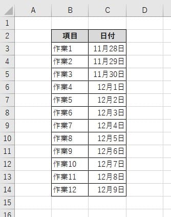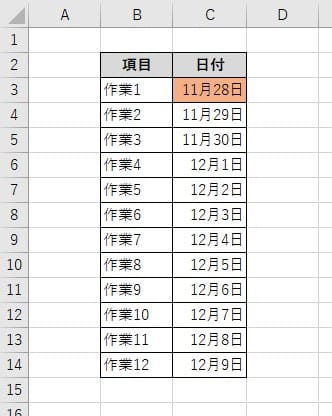 この記事を執筆しているのは11月28日ですので、一番上の列、C3のセルの色を「期限切れ」として、文字を赤文字・太文字にしていこうと思います。