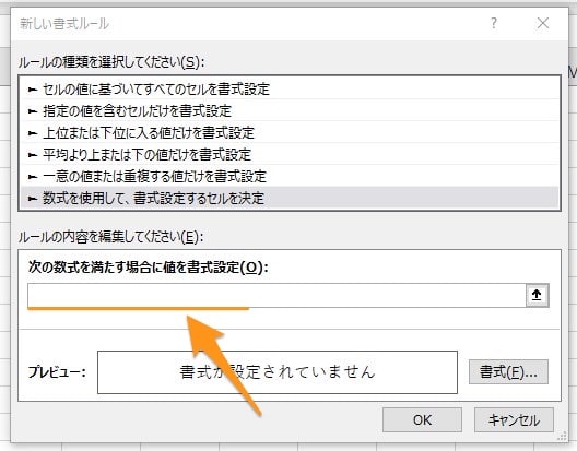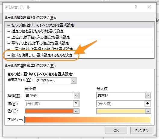 いくつかルールがありますが、この中の「数式を使用して、書式設定するセルを決定」をクリックします。