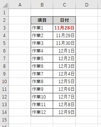 先程の設定が反映されて、11月28日のセル(C3)が、そのように赤文字・太文字になっていることがわかります。
