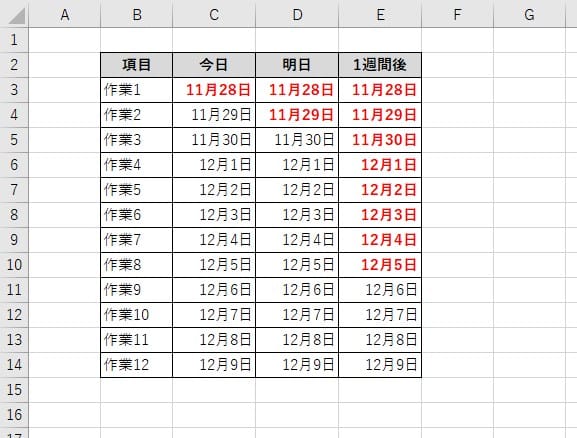 今回は、期限が来た日付のセルを赤文字・太文字に設定してみました。
