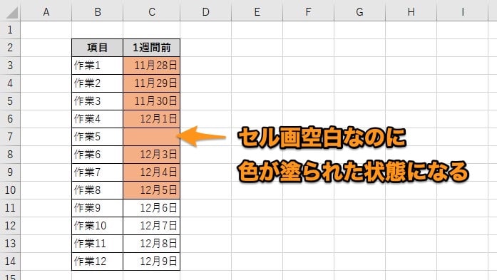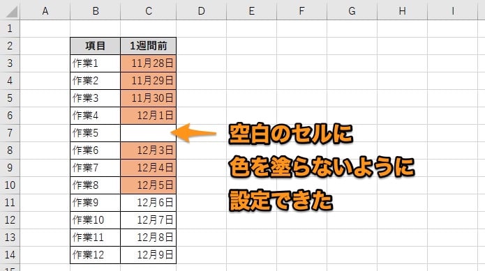 これが翌日の11月29日になれば、その下のセルにもオレンジ色が自動的に塗られることになります。