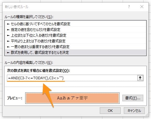 同じように「-7」をすれば、1週間後に期限が迫った場合に色付けする、という条件付けとなります。