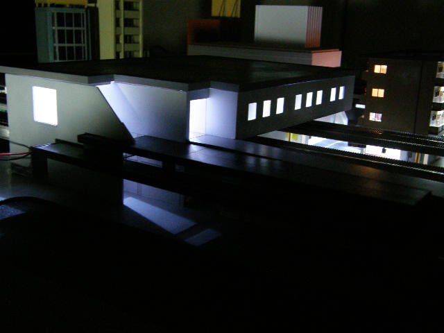 香里園駅の駅舎本体にLEDを仕込んで点灯実験です。画面中央の位置口の上の部分から漏れるのは覚悟してましたが、予想外だったのが駅舎正面の部分の窓が並んでいる部分の中央。どうも屋根がプラ板の一枚もので桟を外周にしか入れていなかったので真ん中が盛り上がってしまっているようです。要修正ですね~