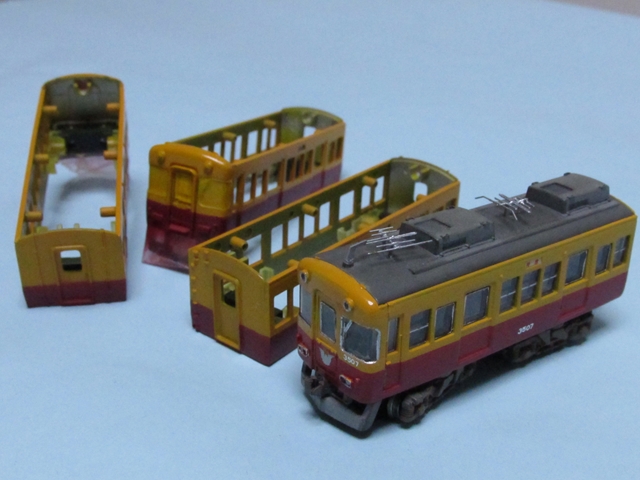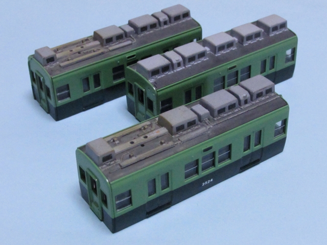 フル編成化すべく中間の三両を作成中。以前の4両は前面を改造したのとそもそも製品の色合いが実車と少々違ったのとで再塗装したのですが、そんなこんなで今回は本当は再塗装しなくても良かったはずなのですがそれに合わせて再塗装。そんなこともあろうかと以前調合して保存していた混色を吹き付けたのですが…う~ん、経年のせいかビミョ~に色相が違う気が…
