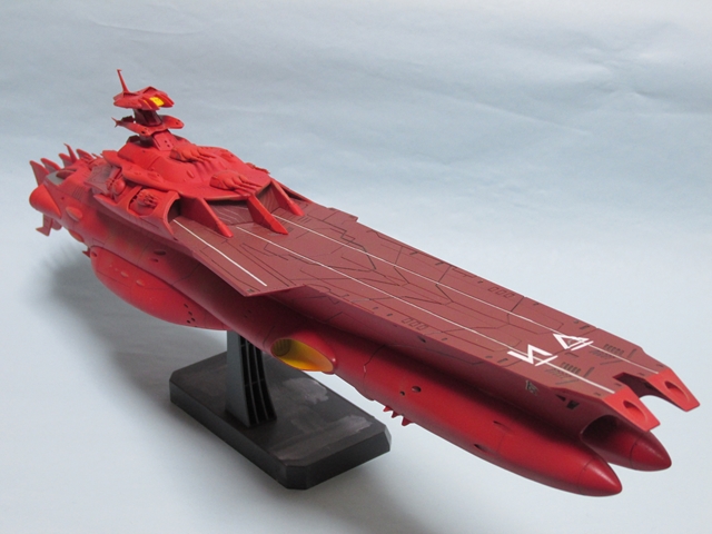 今回は前回の反省を踏まえ、前回のデカールの型紙を少し小さく切って大きさ確認をしてから挑戦しました。で、その後に艶消しクリアーして、軽くウエザリングして母艦は目出度く完成です~。