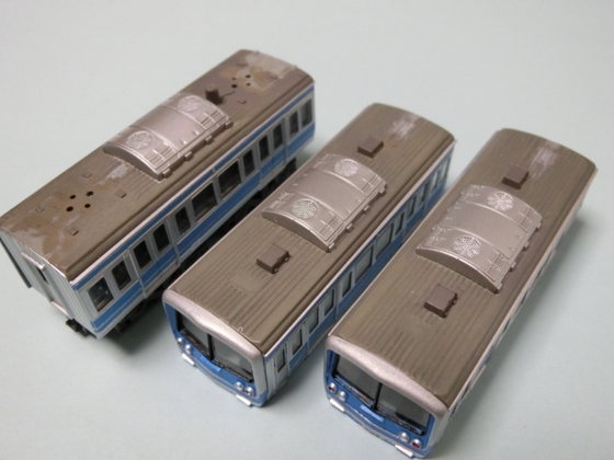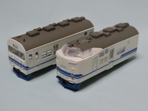 この子、(実車を再現しているという意味で(^o^;))いい雰囲気なのですが、先回記事の通り485系よろしくやたらと目立ち、また一部魔改造時に埋められた部分もあるのでそこを修正し再塗装...というか一部修正塗装。ついでに色のかすれや帯のズレもそれらしく修正。完全再塗装ではないので一部妥協部分もありますが、素組みよりは大分いい感じに。