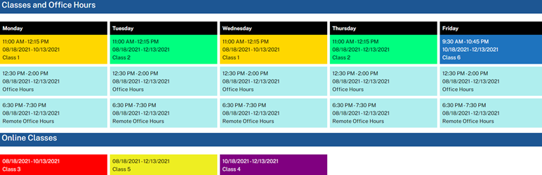 Create a schedule for a semester that will display the office hours and classes of a faculty member to visitors of a site in a weekly format.