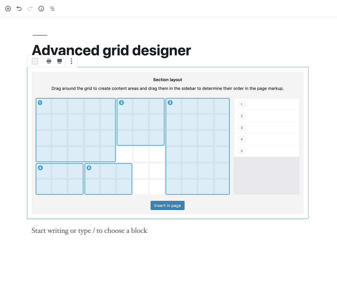 For more elaborated compositions, the Grid Designer allows you to create exactly the grid structure you want within the boundaries of a Section, by using CSS Grid.