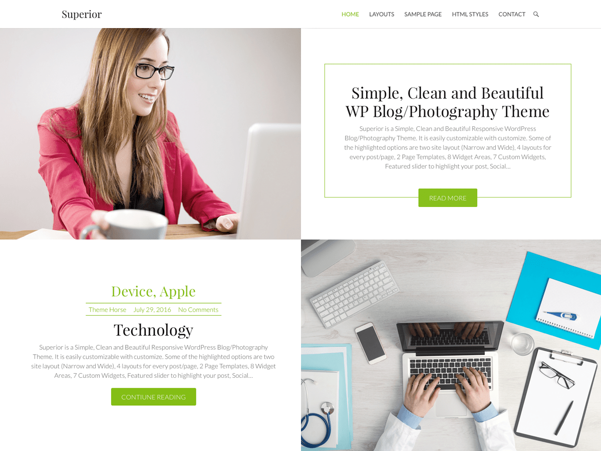 Superior is a Simple, Clean and Beautiful Responsive WordPress Blog/Photography Theme. It is easily customizable with customize. Some of the highlighted options are two site layout (Narrow and Wide), 4 layouts for every post/page, 2 Widget Areas, Featured slider to highlight your post, Social Profile Navigation and many more. Also has custom background, header, menu, favicon, webclip icon, and logo. Supports popular plugins like WooCommerce, bbPress, Breadcrumb NavXT, WP-PageNavi and Contact Form 7 and many more. It is also translation ready. Get free support at https://www.themehorse.com/support-forum/ and view beautiful demo site at https://www.themehorse.com/preview/superior