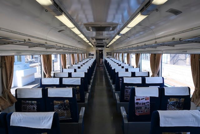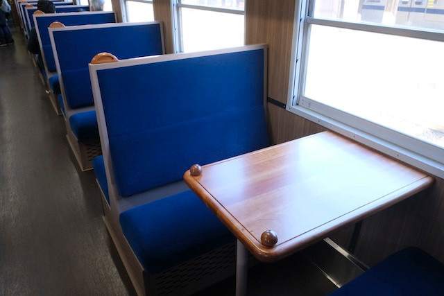 14系車内。回転式リクライニングシートですが、簡易リクライニングのため、途中の角度で止めることはできず、自分がもたれかかっている時だけリクライニングします