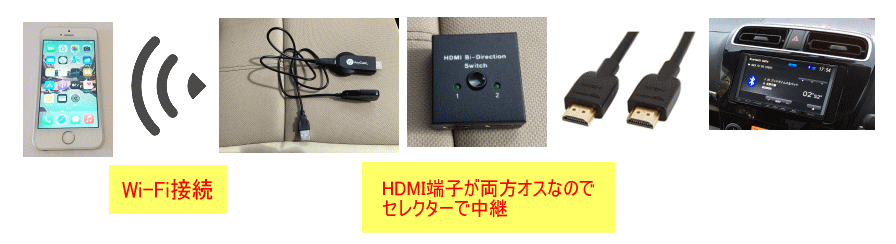 接続のイメージは以下のとおり、ナビから出ているHDMIケーブルとAnycastをセレクターで中継接続するだけ。