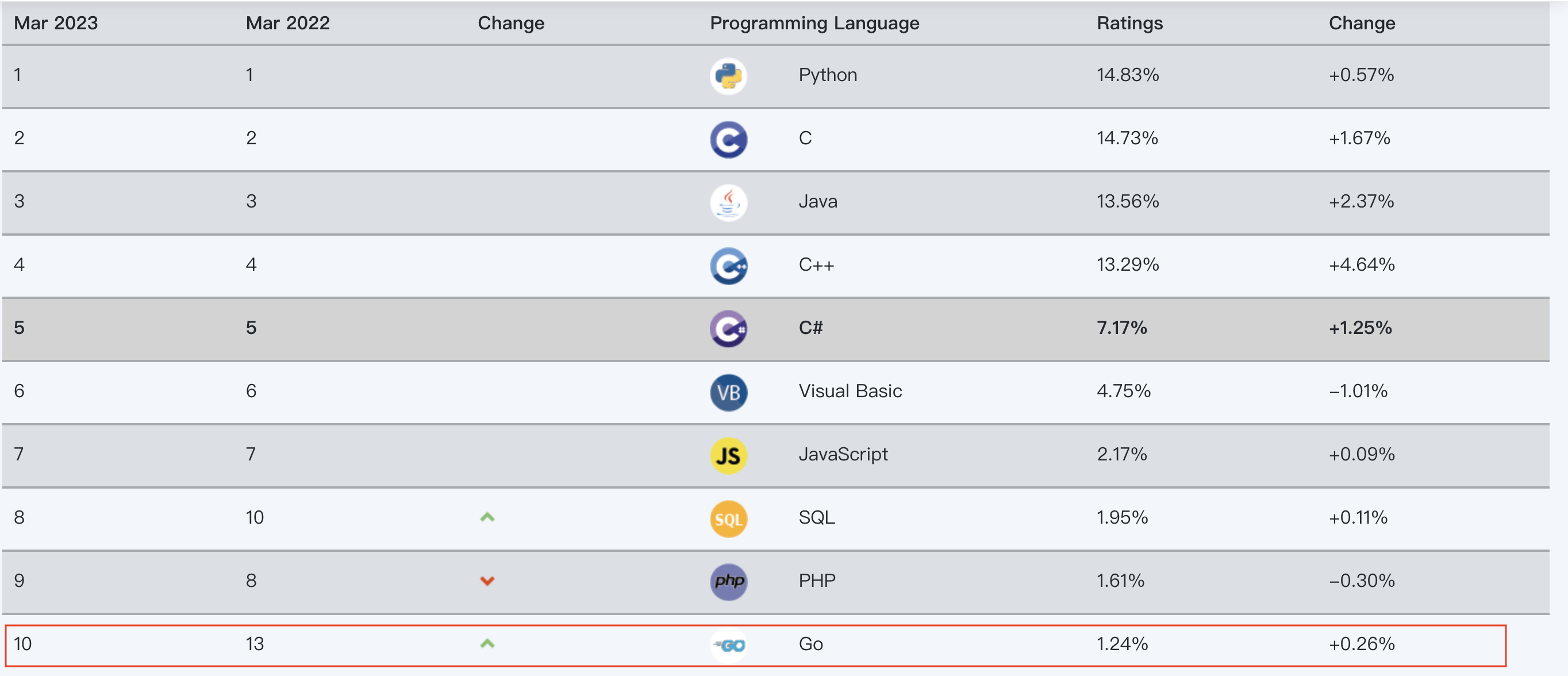 在《2022年Go语言盘点》一文中,我们提到年初Go语言的2022年终排名为12位,同时TIOBE官方编辑也提到:“在新兴编程语言中,Go是唯一一个可能在未来冲入前十的后端编程语言”。Go语言的发展似乎应验了这一预测,在今年的3月份,Go就再次进入编程语言排行榜前十: