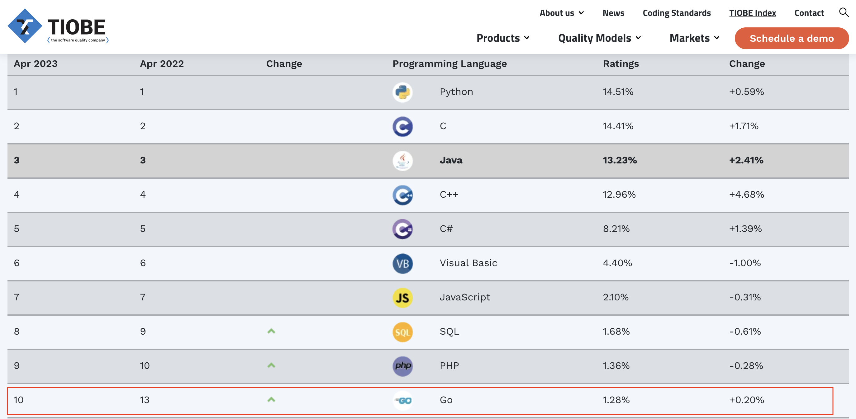 一个月后的四月初,TIOBE排行榜上,Go稳住了第10名的位次: