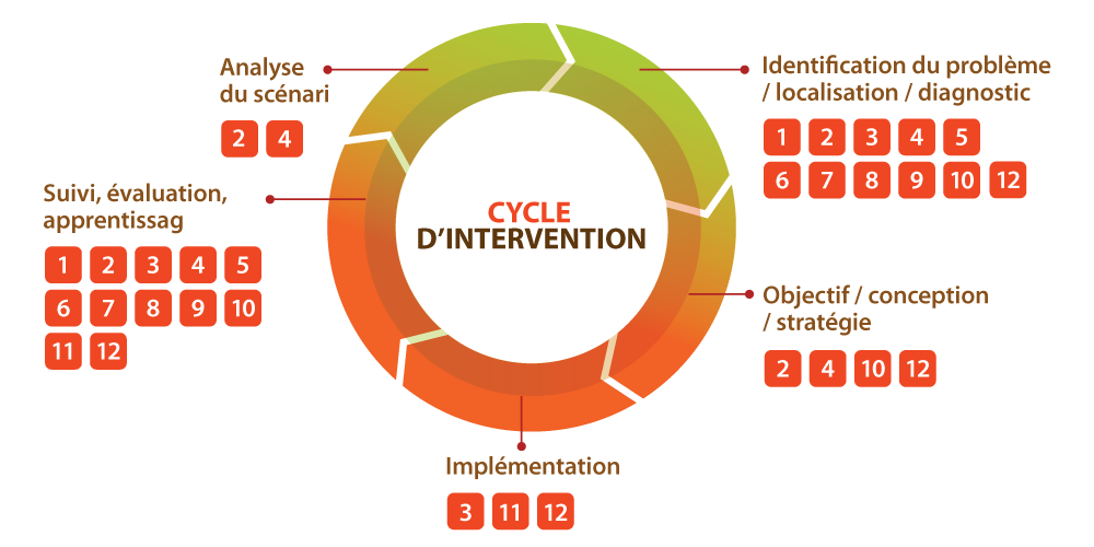 Utilisez le guide en bas pour déterminer ou les outils sont appliques dans le cycle de l’implémentation d’un projet. Le nombre de chaque outil correspond à la légende. Cliquez sur le nom d’un outil pour naviguer à sa page détaillée.