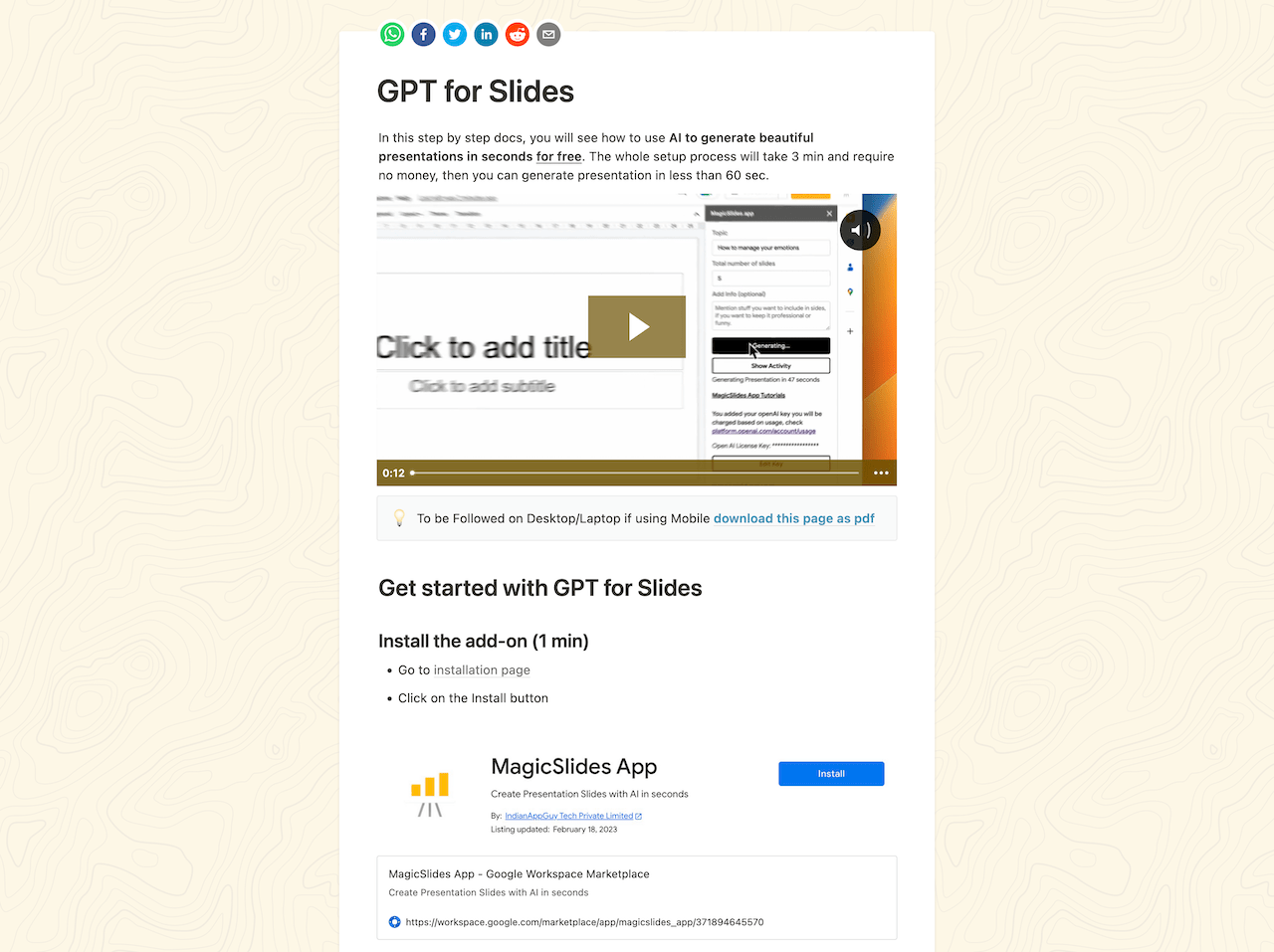 In this step by step docs, you will see how to use AI to generate beautiful presentations in seconds for free. The whole setup process will take 3 min and require no money, then you can generate presentation in less than 60 sec.