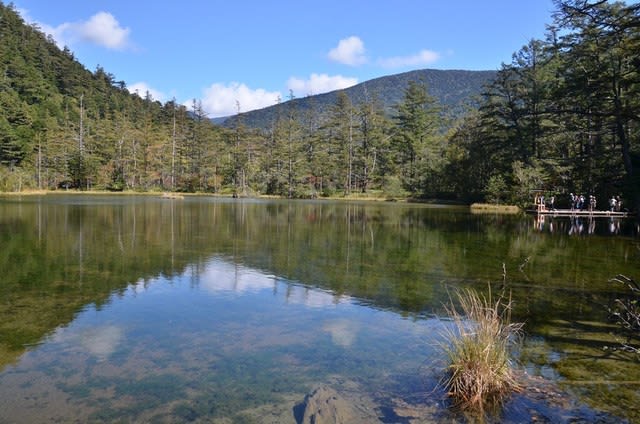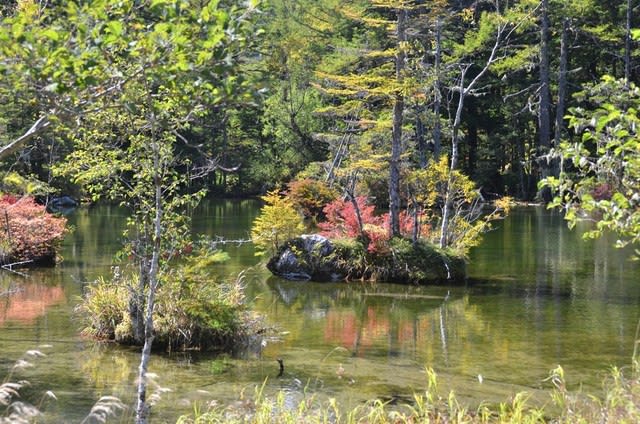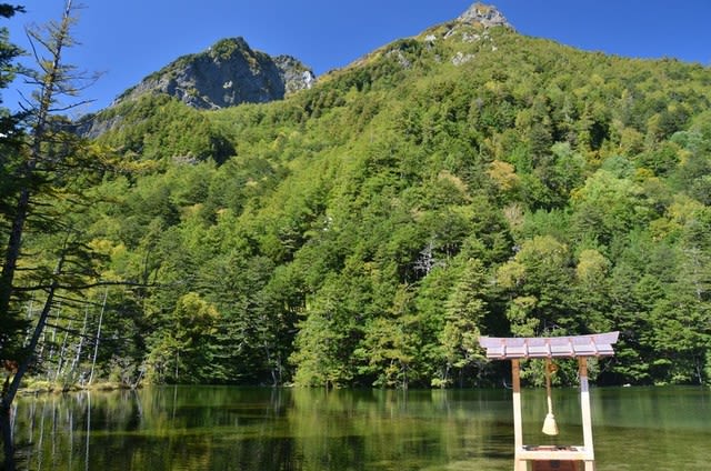 河童橋から紅葉し始めた森の中を歩き、明神池までやってきました。