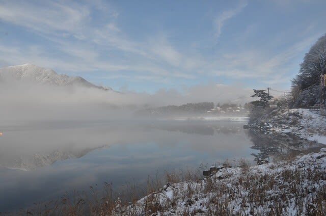 新雪の林を抜け、河口湖に到着すると