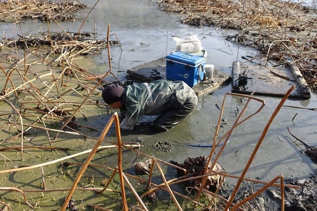 途中、レンコンを収穫する人を見つけました。 ↑