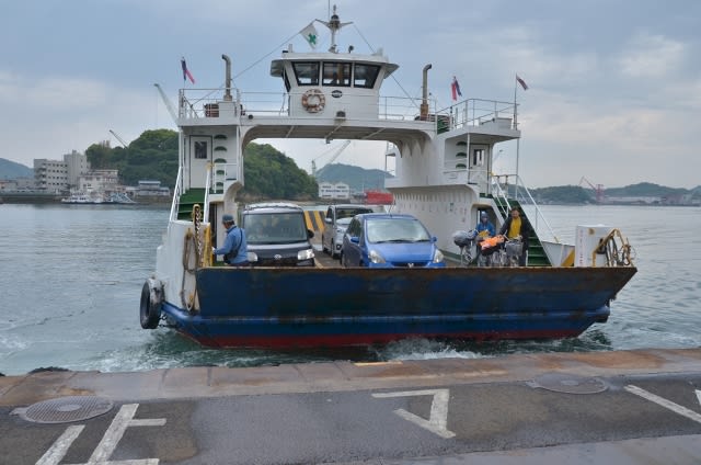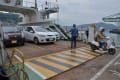 向島側で、乗用車が何台か乗りこむ様子。