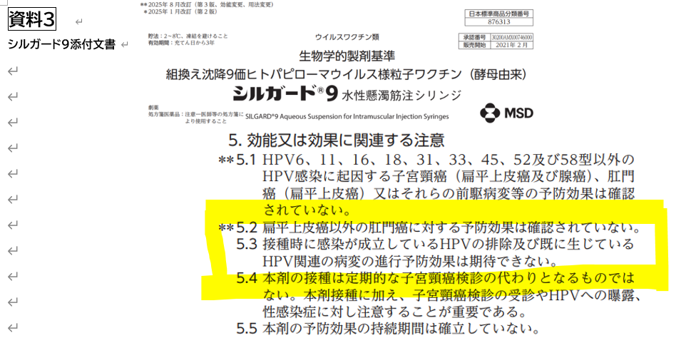 効能または効果に関連する注意として、「5.3接種時に感染が成立しているHPVの排除及び既に生じているHPV関連の病変の進行予防効果は期待できない」と書かれています。