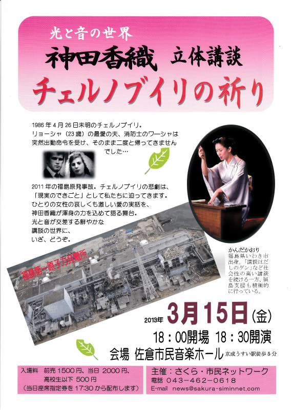 本日は、神田香織さんの立体講談「チェルノブイリの祈り」を佐倉市民音楽ホール(京成臼井 徒歩3分)当日です。