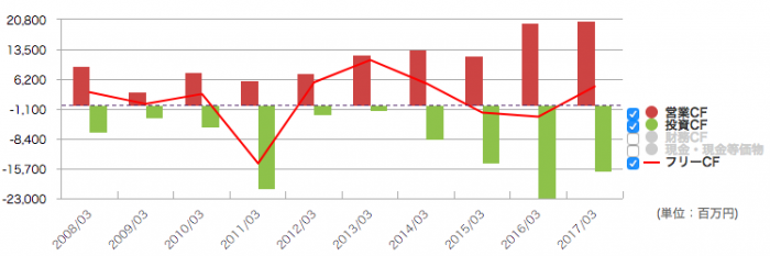 ウォーレン・バフェットも言っていますが競争優位性のある会社では現状を維持するために、内部留保の大きな割合を再投資する必要が無く、下記のように営業キャッシュフローが右肩上がり、フリーキャッシュフローも右肩上がりの推移を示すことが多いです。
