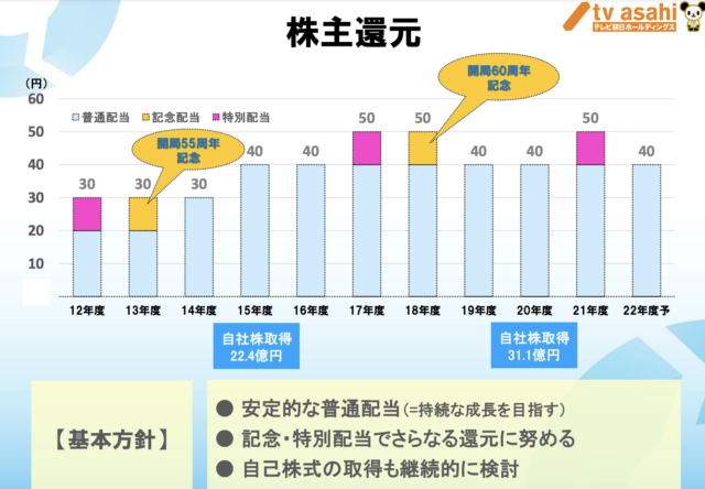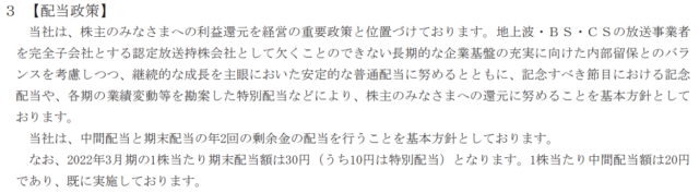 また、有価証券報告書の配当政策は簡素となっており、日本テレビやTBSと比べると若干ネガティブに感じます。