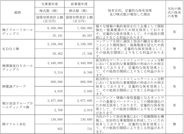 テレビ朝日は日本テレビと同様にリクルートの保有割合が多くなっていますが、2番手がKDDIになっているなどポートフォリオに若干の違いがみられます。