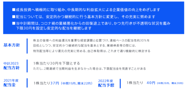 また、決算説明資料では配当性向と配当下限(30円)について言及しています。