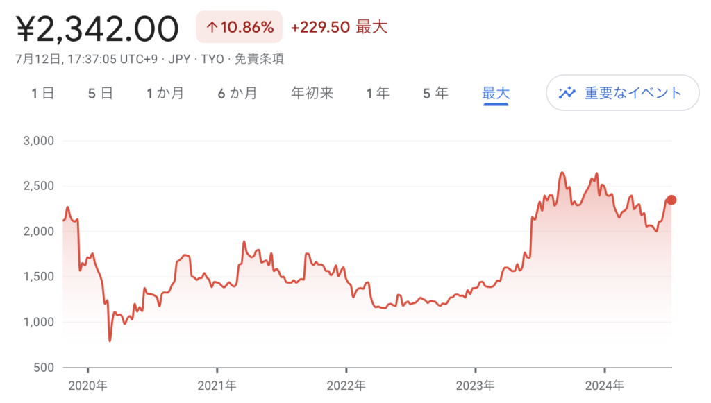 2024/07/14までの年初来パフォーマンスは上図の通り。好調な日経平均を尻目に年初来マイナスパフォーマンスと低調な株価推移。