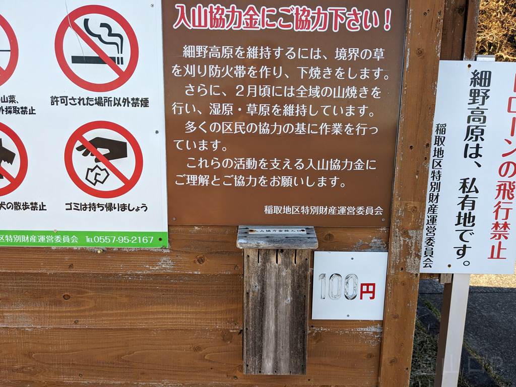 国道135号線、伊豆稲取駅付近から細野高原方面に向かって進みます。途中で分岐がありますが、「細野高原」の案内看板に従って進んでください。離合困難な森の中の道を進み、森が無くなり開けると細野高原となり、第2駐車場、第1駐車場の順で駐車場があります。なお、山菜狩りが目的の人は入口の管理事務所で確認してから入山してください。