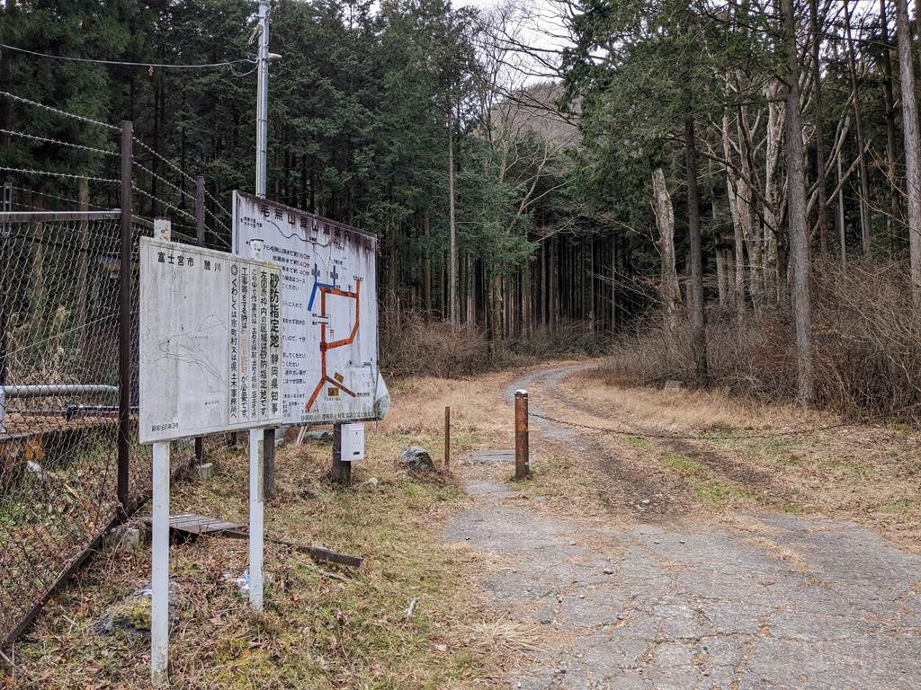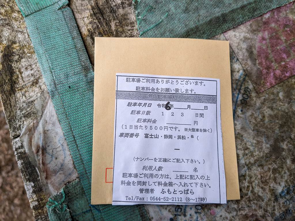 新東名の新富士インターから国道139号(西富士道路、富士宮道路)を経由して25㎞、「ふもとっぱら」方面に曲がります。ふもとっぱらキャンプ場を横目に進み、キャンプ場を過ぎた先の行き止まり地点が駐車場です。未舗装ですが、整地されたきれいな駐車場です。駐車場看板横のボックスに封筒とペンが用意してあるので、封筒に必要事項を記入し、お金を入れた封筒をポストに投函します。