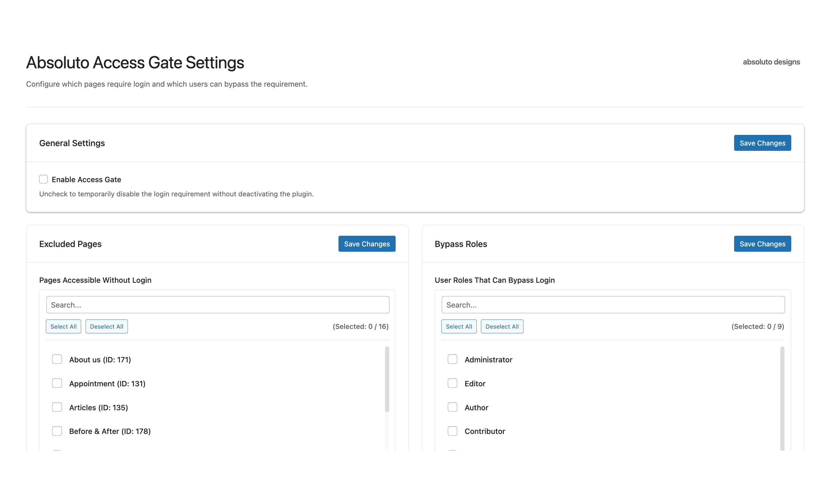 After activating the plugin, navigate to Settings > Absoluto Access Gate to configure: