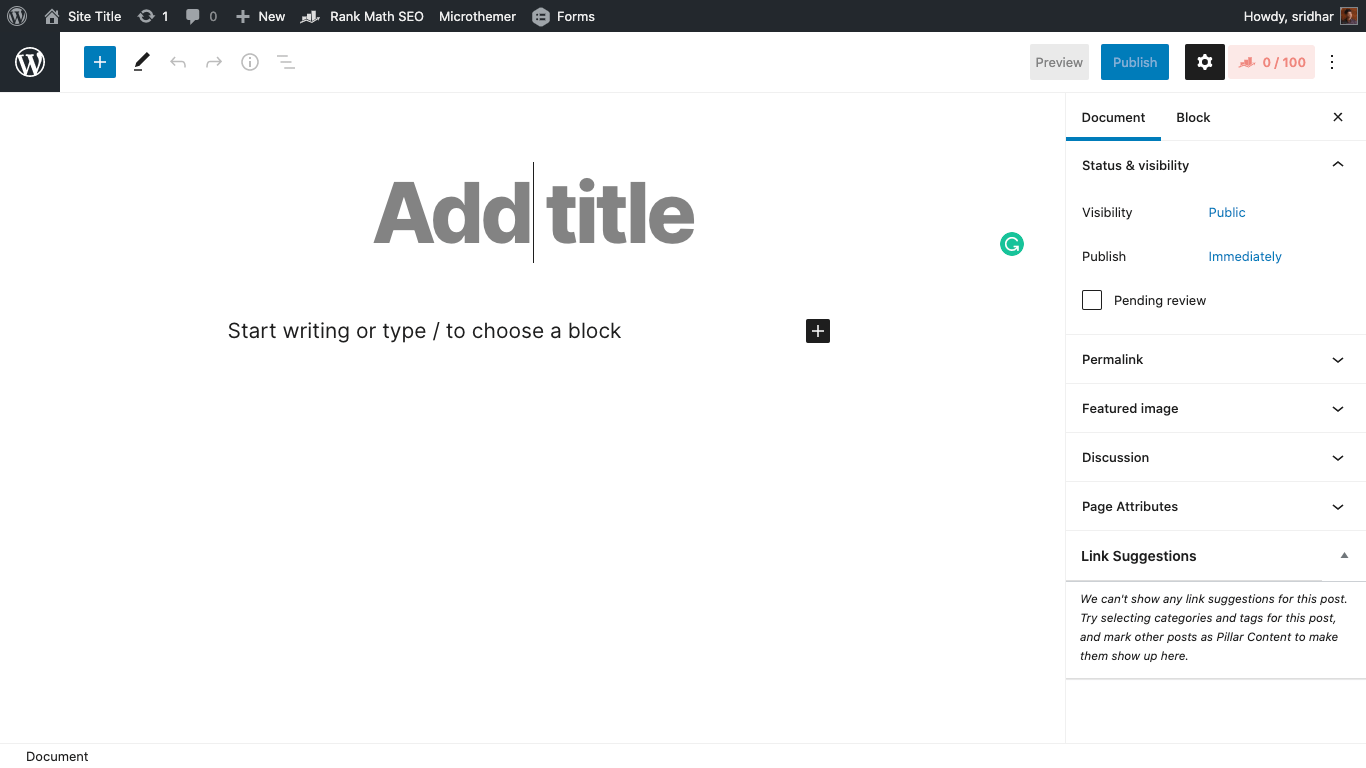 When a new Page or Post is being edited in the WordPress Gutenberg editor in Fullscreen mode the WordPress admin bar aka The Toolbar will not appear by default.